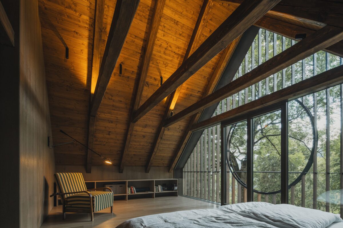 Podkrovní prostory jsou v duchu původních podstřešních prostor velkoryse otevřeny a poskytují soukromí jednotlivým členům rodiny.