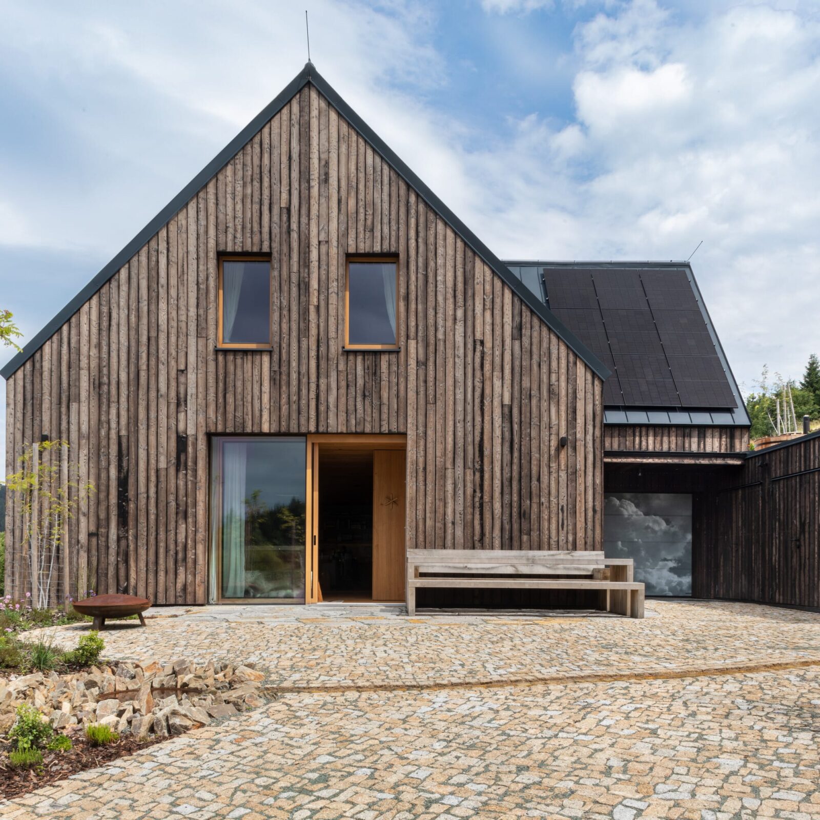 Přáním investora bylo vytvořit domov, který se krajině nepřizpůsobuje jen vizuálně, ale skutečně s ní žije. Architekti z ateliéru OK Plan Architects pod vedením Luďka Rýznera proto navrhli stavbu, která ctí místní charakter, zároveň ale nabízí veškeré pohodlí současného luxusního bydlení. V interiéru se střídají přírodní materiály – dřevo, kámen, kov – a vynikají v kontrastu s pečlivě vybranými kusy moderního umění.