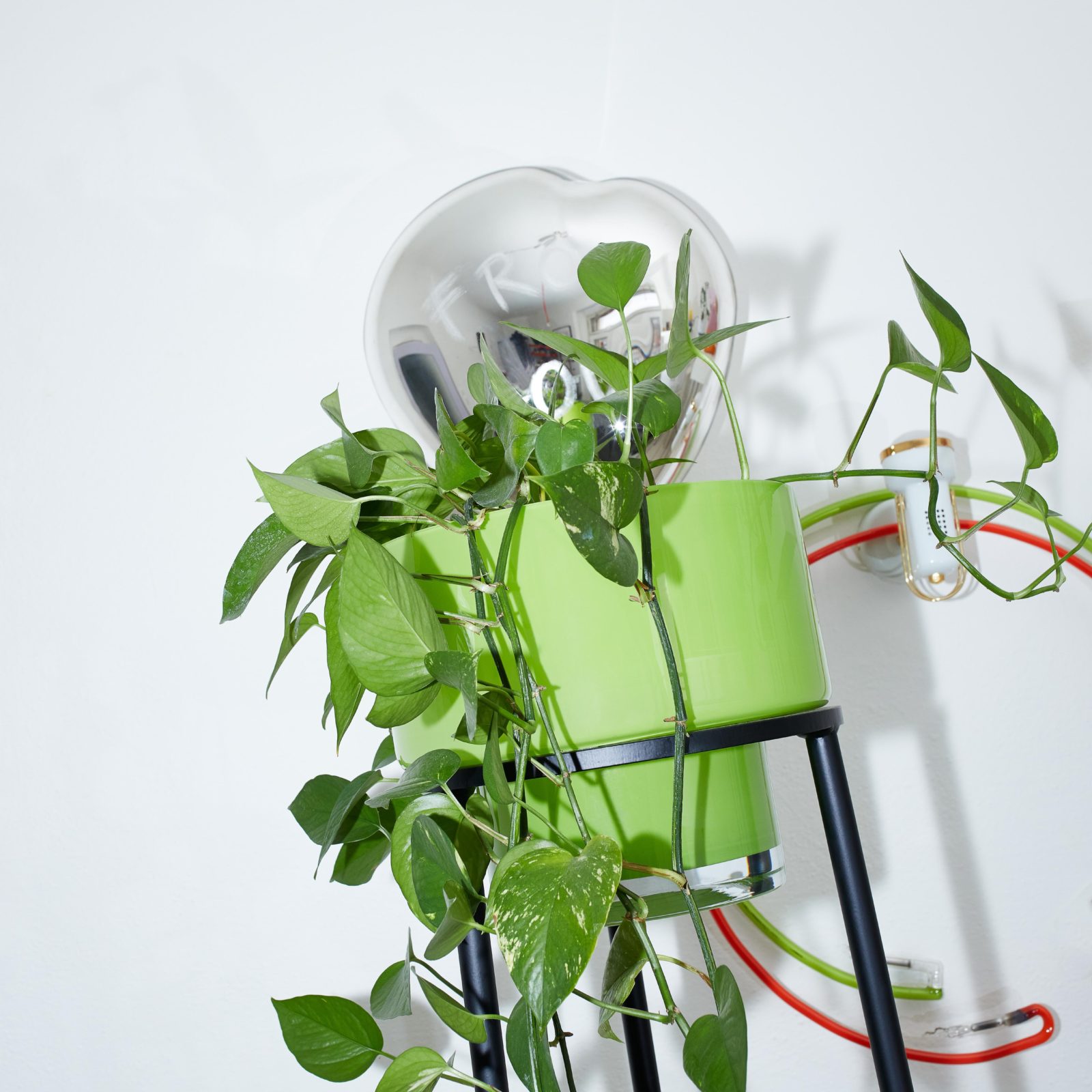 „Stojan původně vznikl jen jako vedlejší instalační produkt pro mé volné umění. Až později jsem si uvědomila, že výborně poslouží i jako stojan na květiny. Stačilo dotvořit skleněný květník a vznikl tento soubor květníku se stojanem pro kytičky, které miluji a hojně pěstuji. Květinám teď díky vyvýšení dopřávám více světla.“