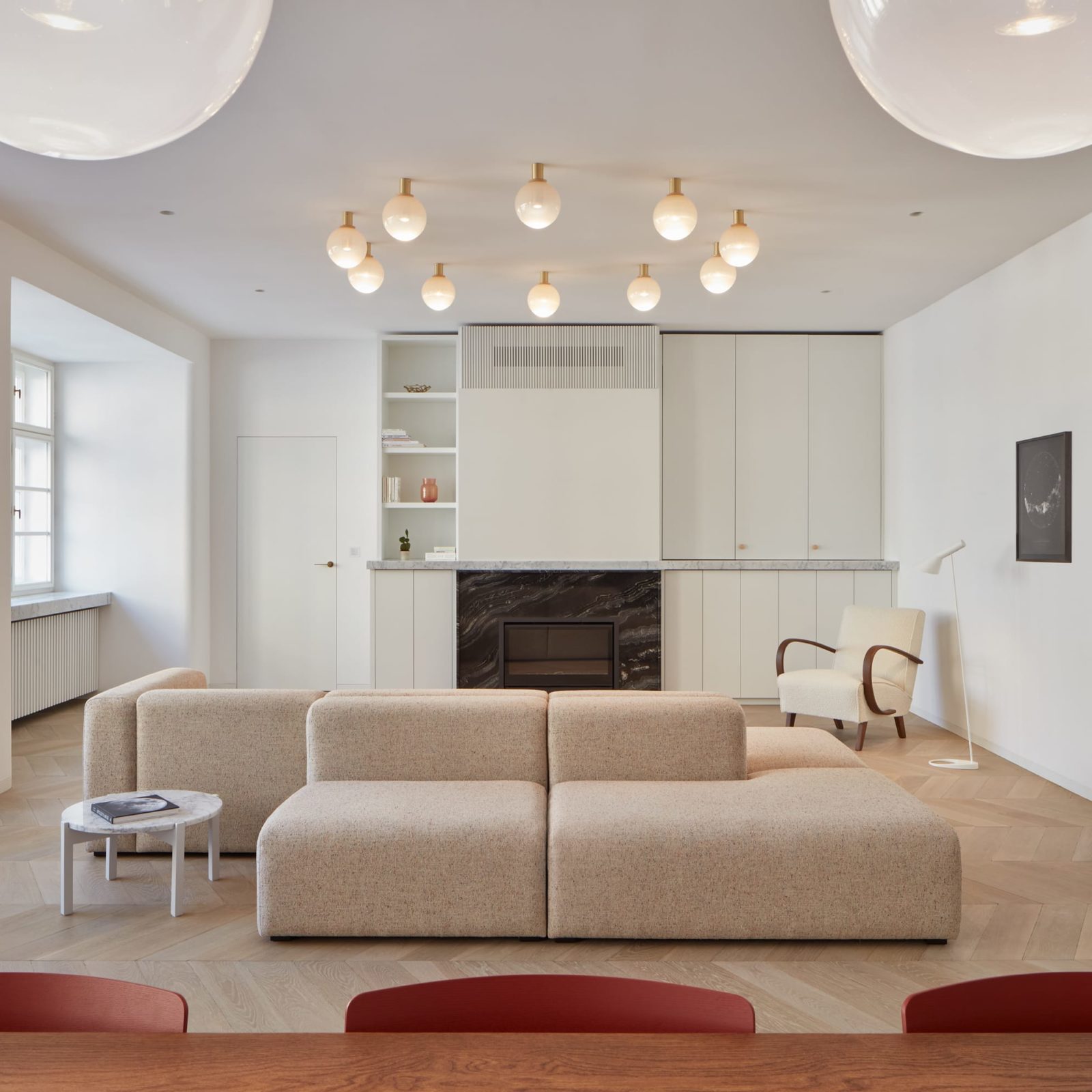 Naše inspirace funkcionalismem vykrystalizovala v jednoduchost tvarů a současně rafinovanost v detailech, v bohaté užití vestavného vybavení a nábytků na míru, plus uplatnění nadčasových materiálů, zejména kamene a kořenové dýhy, říká architektka Lenka Míková, jež stojí ze pozoruhodnou rekonstrukcí luxusního činžovního bytu na Starém Městě v centru Prahy.