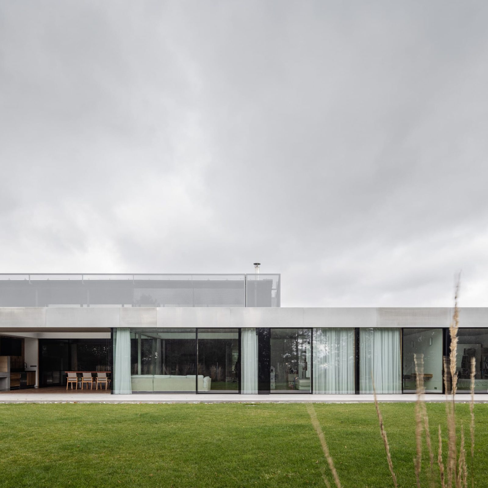 Rozhraní mezi terasou a interiérem není lineární. U obytné haly architekti vytvořili pravoúhlý meandr vstupující dovnitř domu. Obytná část terasy je tak intimně zapuštěna hlouběji do centra stavby, kde se využívá jako plnohodnotná letní kuchyně s jídelním i obývákovým sezením.