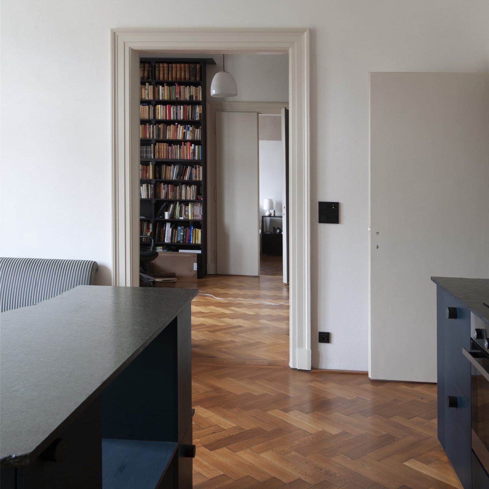 V prostorách architekti Anna Svobodová a Ondřej Blaha ze studia svobodová blaha zachovali koncepci tří hlavních průchozích místností, které nově slouží jako obytná kuchyně, prostřední místnost jako pracovna s knihovnou a dvěma oddělenými šatnami. Třetí místnost v rámci této enfilády zakončuje ložnice, ze které je nově přístupná druhá koupelna se sprchovým koutem. Ta původně sloužila jako kuchyňka, přístupná pouze z úrovně mezipodesty schodiště. Druhá zóna bytu je chápána a užívána spíše jako prostornější pracovní koupelna s pračkou a rezervní pokoj pro hosta či dítě.