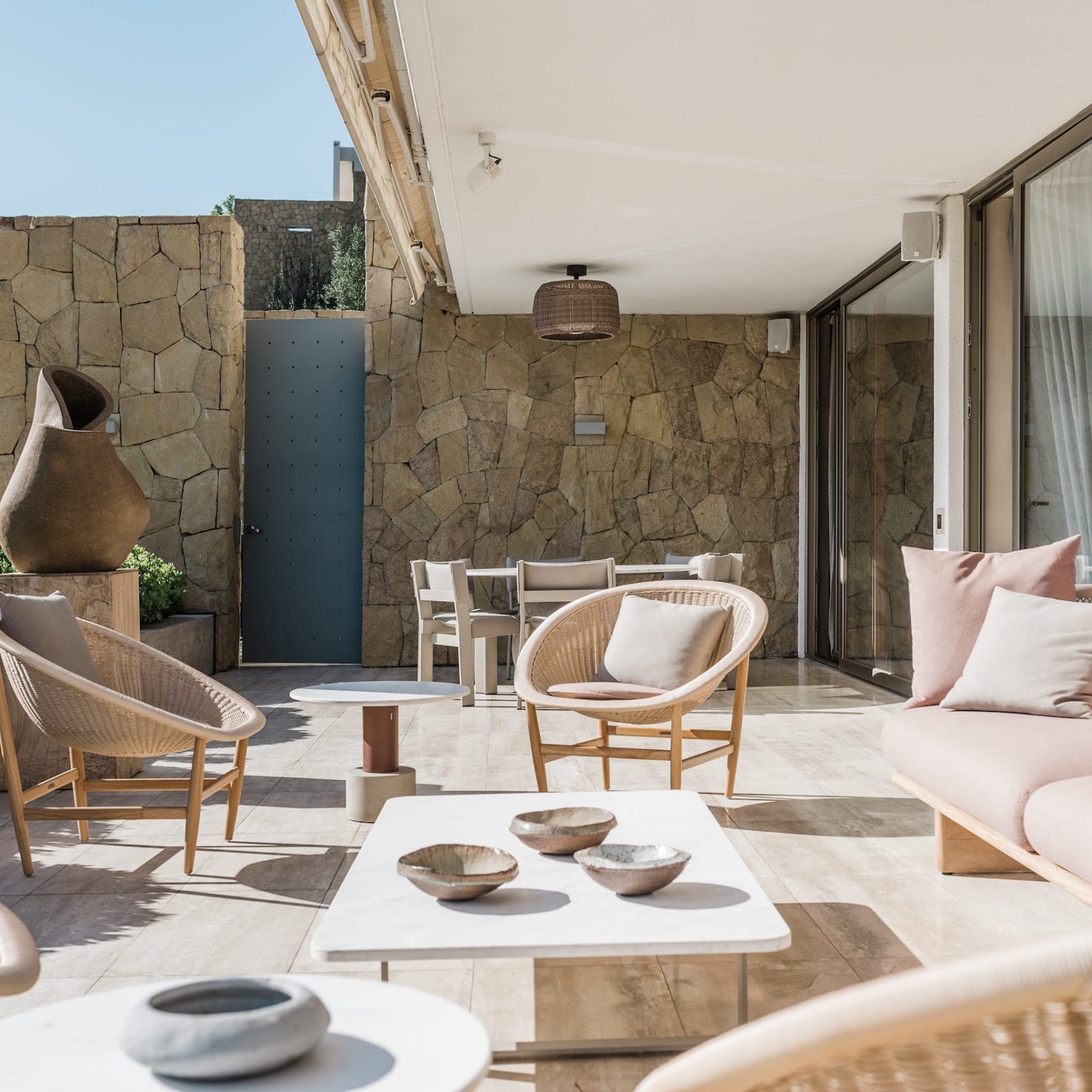 „Hlavní pokoje se stěnami v různých barevných odstínech byly vybaveny osvětleními od francouzského designéra Herve Van der Straetena a nádhernou keramikou chilských umělců,“ říká Paula Gutierrez.“ A pokračuje: „Většina nábytku, a to včetně rozlehlé terasy s výhledem na Andy, pochází od uznávané španělské značky Kettal, přesněji z kolekcí od designérů Patricii Urquoily, Rodolfo Dordoniho a Jorgena Ditzela. Nábytek v růžových, šedých a terakotových odstínech dokonale ladí s telurickou krajinou Chile.“