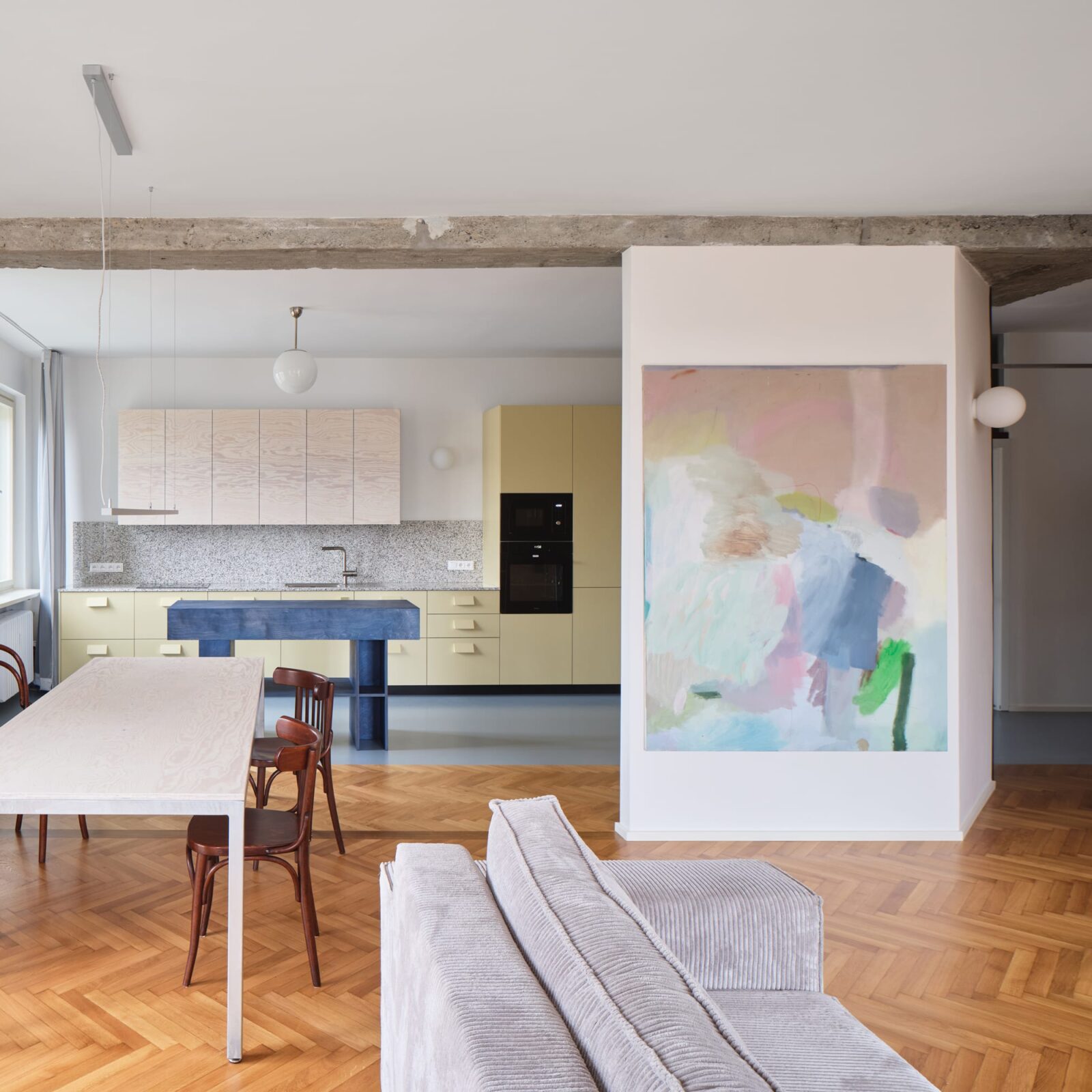 Hlavním cílem proměny pražského bytu o ploše 115 m² bylo přizpůsobit prostor modernímu provozu, aniž by došlo k potlačení jeho původního charakteru. Výraznou změnou prošla centrální část bytu, kdy odstraněním příčky mezi dvěma pokoji vznikl velkorysý obývací prostor, který naplno využívá výhledy na Vltavu z předposledního patra domu.
