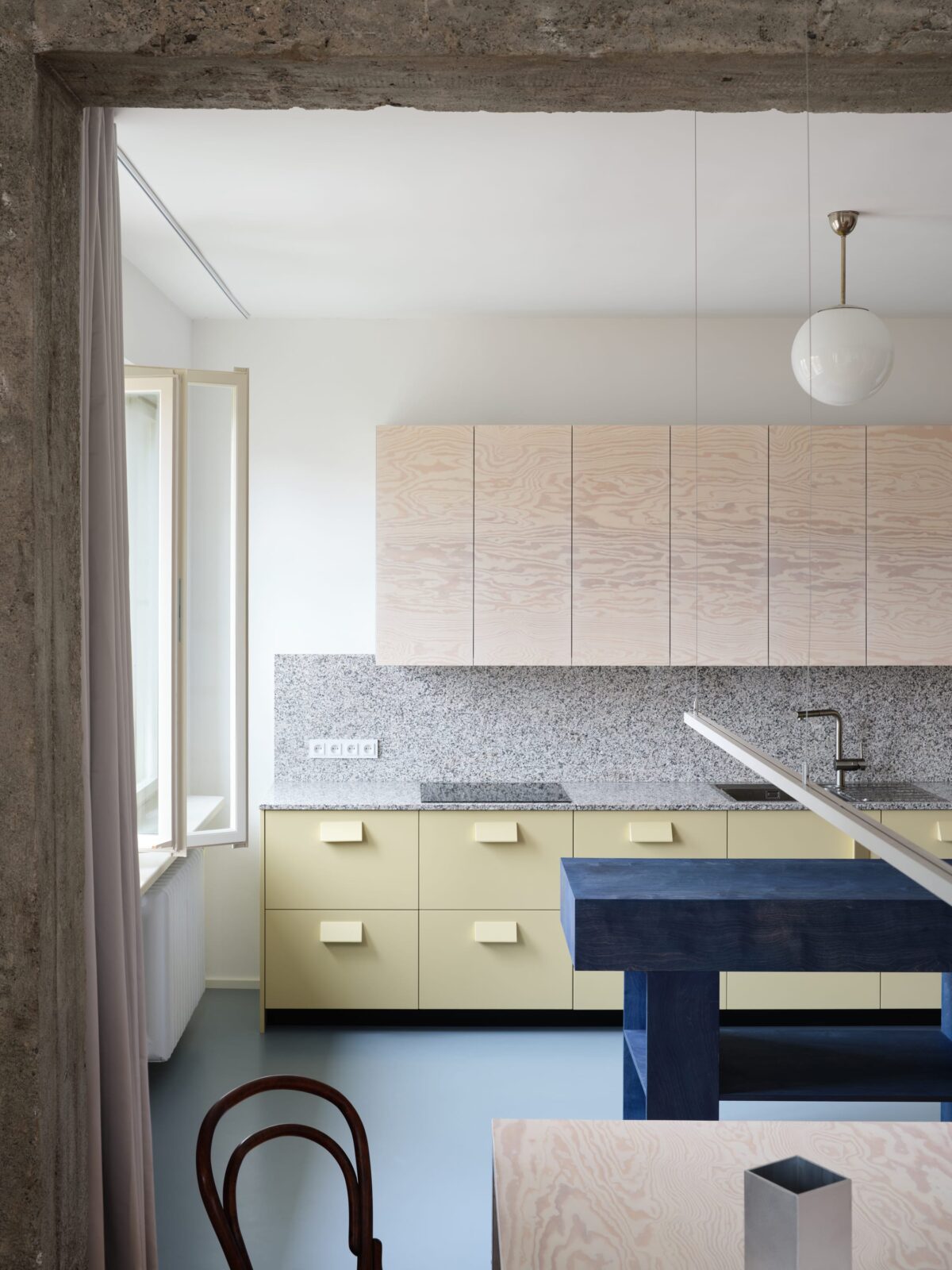 V interiéru najdeme ikonické židle od značky Ton, svítidla od HAY či Ideal Lux, vypínače ABB a armatury Grohe. Výrazným prvkem je jídelní stůl vyrobený na zakázku z žárově pozinkované oceli a bělené borovicové překližky…