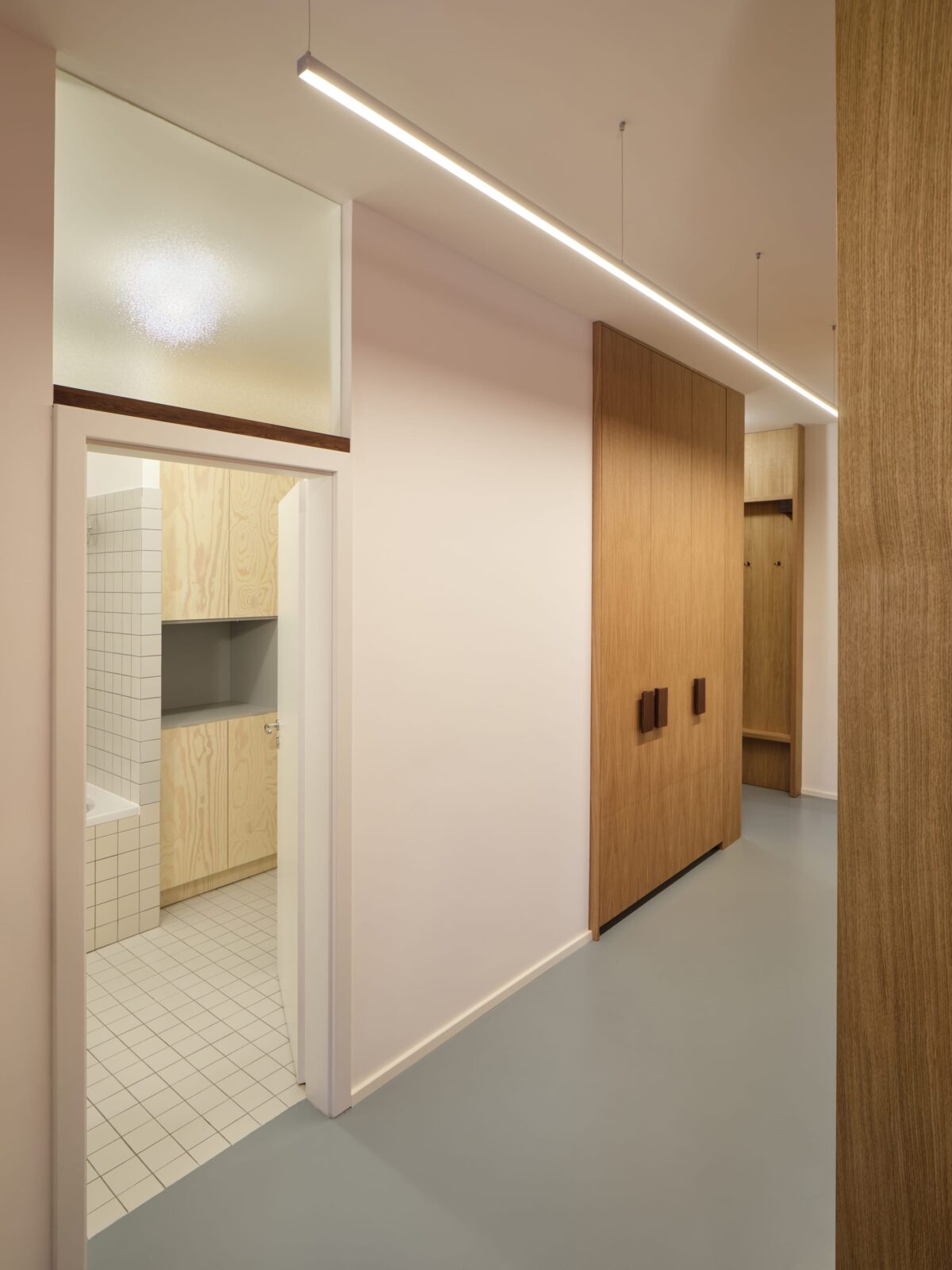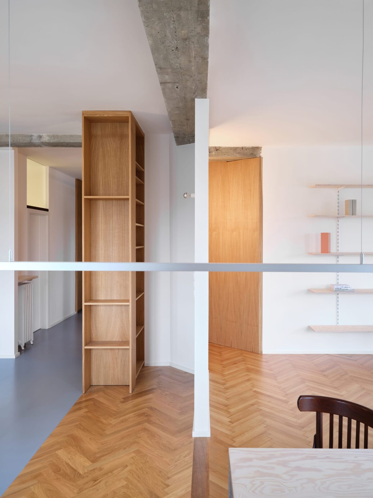 Architekt kladl důraz na zachování původních prvků. Renovované dveře doplnily nové světlíky, které propouštějí denní světlo hlouběji do dispozice. Celým interiérem se prolínají detaily z tmavě mořeného dřeva a autorský nábytek značky anýz, kterou Prokop Hartl sám založil jako platformu pro svůj designový výzkum.