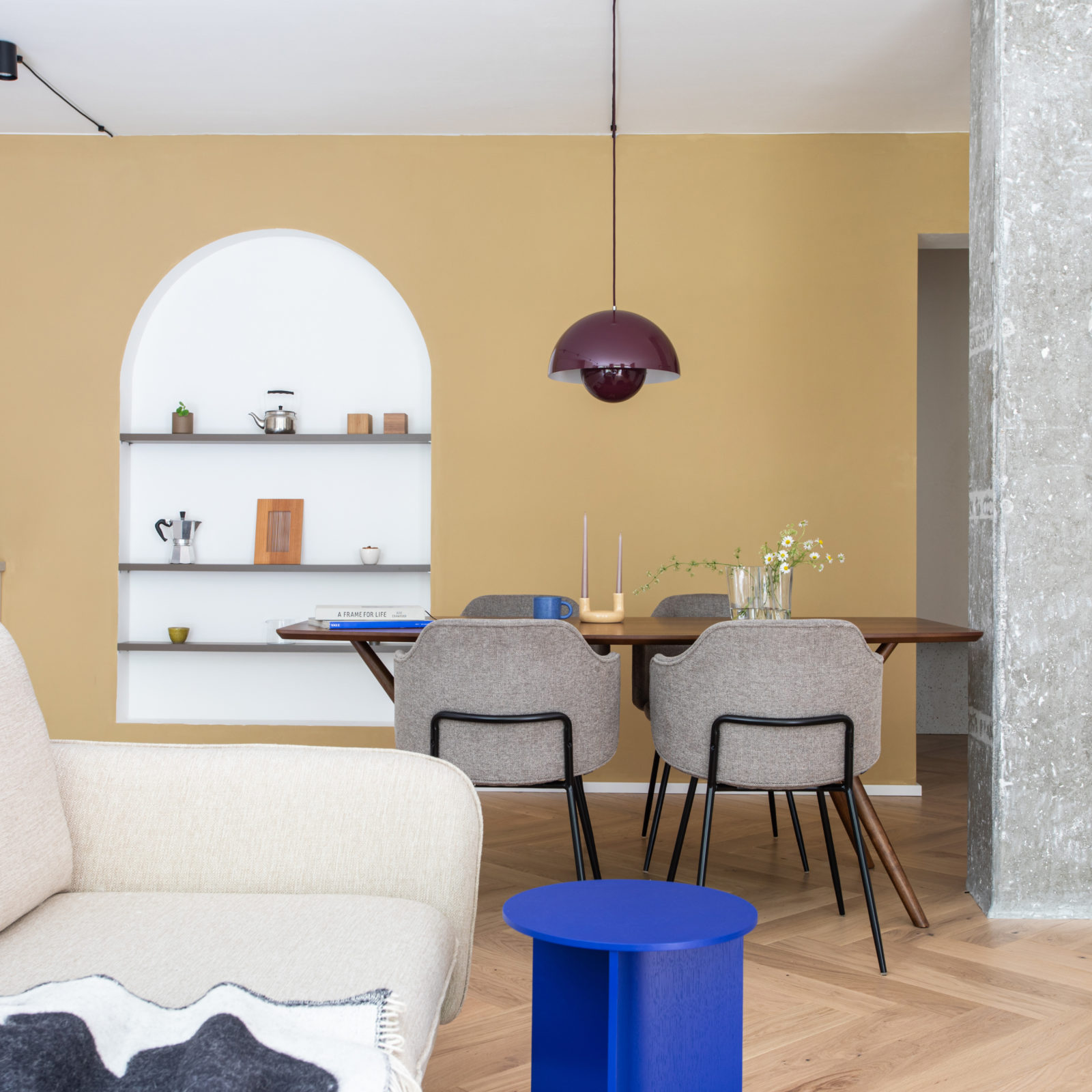 Bílé stropy doplňuje na některých stěnách odvážný okrový akcent ladící se závěsy ve stejné barvě a zemitými odstíny vzorku na dlažbě. Ve stejném duchu, tedy hnědé a béžové barvě, se nesou i další doplňky jako jídelní stůl, pohovka a nástěnná svítidla. Zdánlivou jednolitost pak rozbíjí závěsná lampa Flowerpot od Vernera Pantona ve švestkové barvě, která je umístěná nad jídelním stolem, a sytě modrý odkládací stolek značky HAY. Posledním výrazným designovým kouskem je váza Iittala od designéra Alvara Aalta.