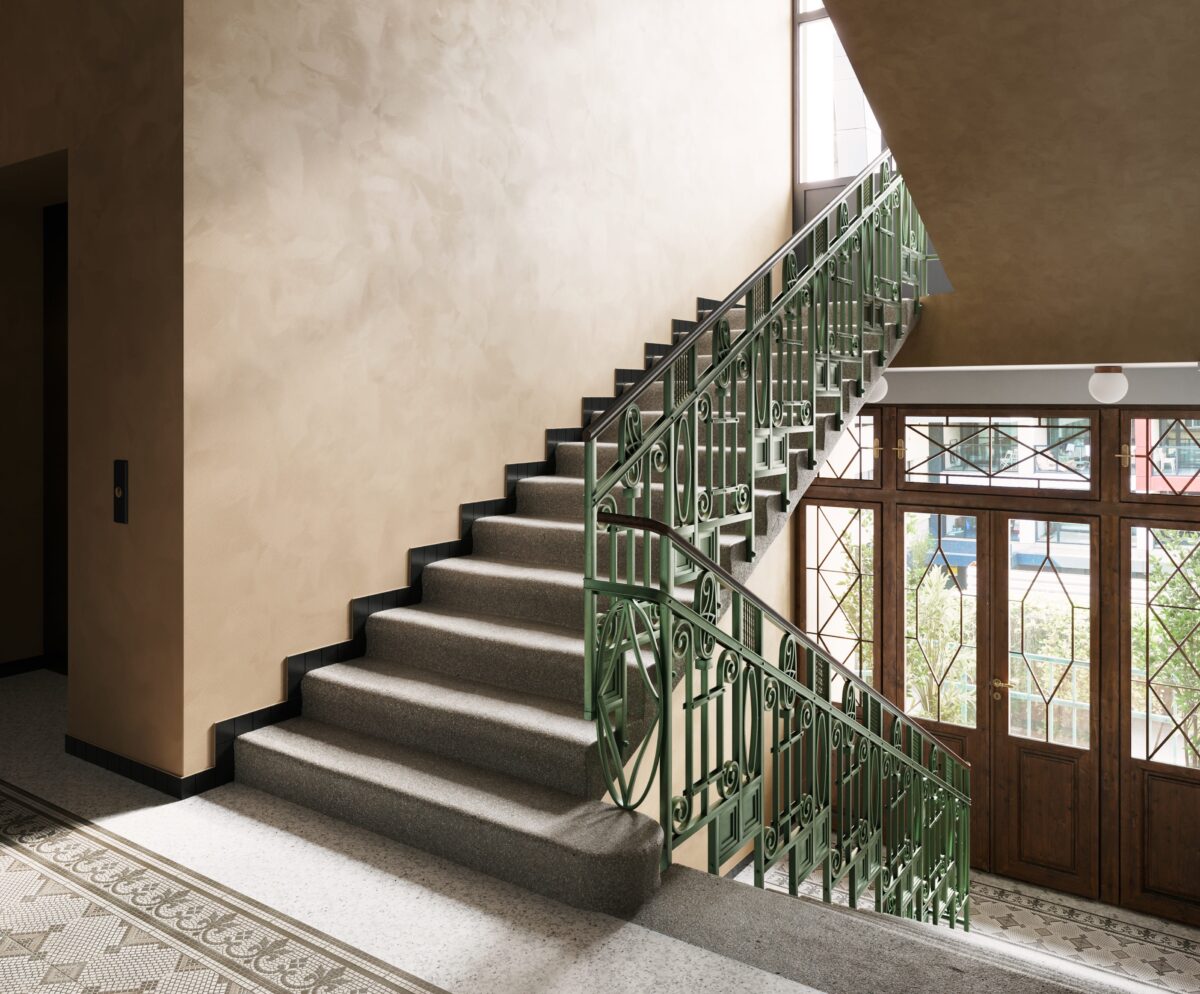 Rekonstrukce zde nepracuje jen s materiálem, ale i s atmosférou. Společné prostory vyznávají přírodní textury a stejně tak decentní barevnost a promyšlené osvětlení, které dodává domu eleganci staré Prahy i nadčasový klid. V interiérech bytů se secesní motivy objevují v současné, abstrahované podobě. „Dům tak nenabízí pouze praktické uspořádání bytů, ale i unikátní atmosféru,” shrnují architekti svůj přístup.