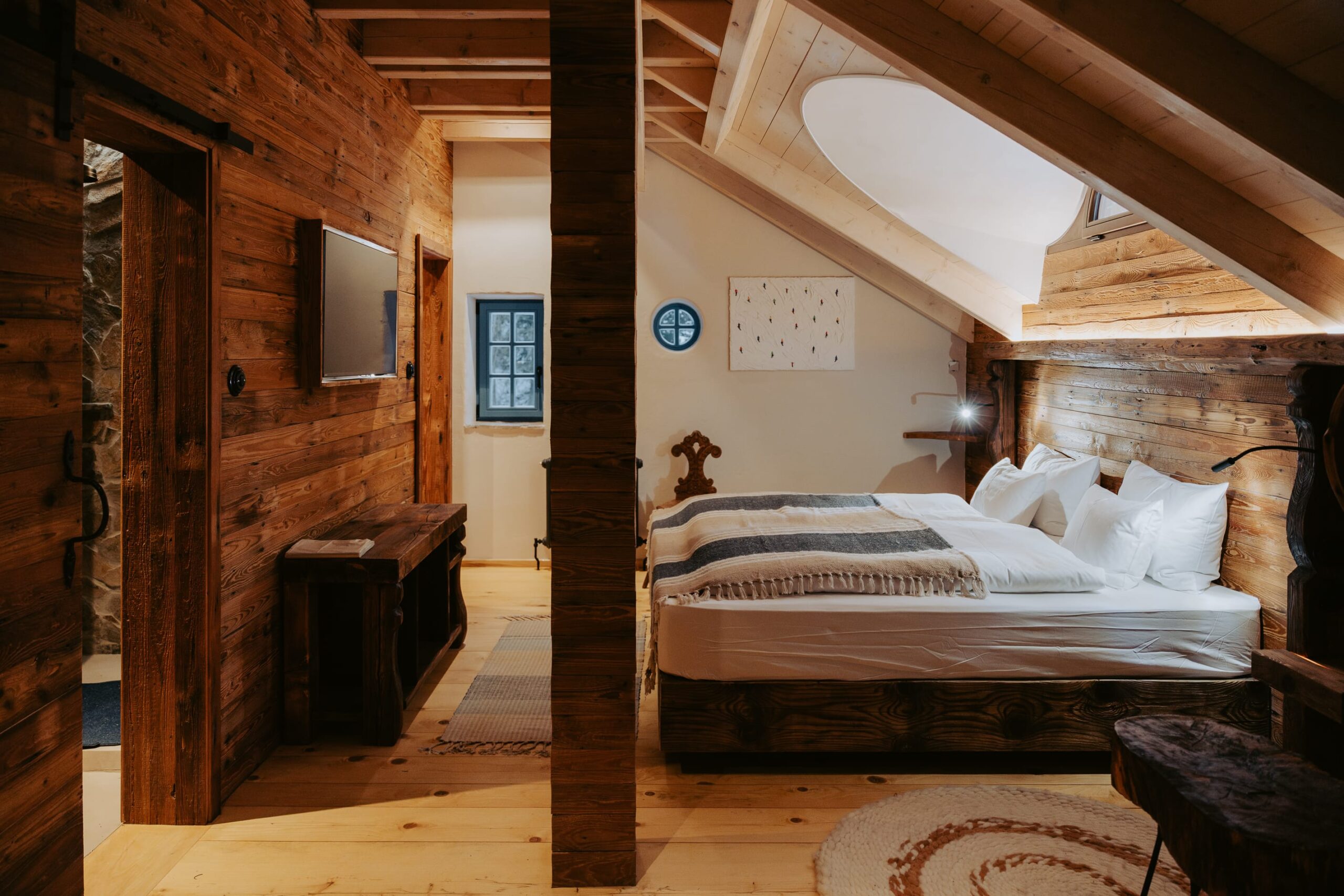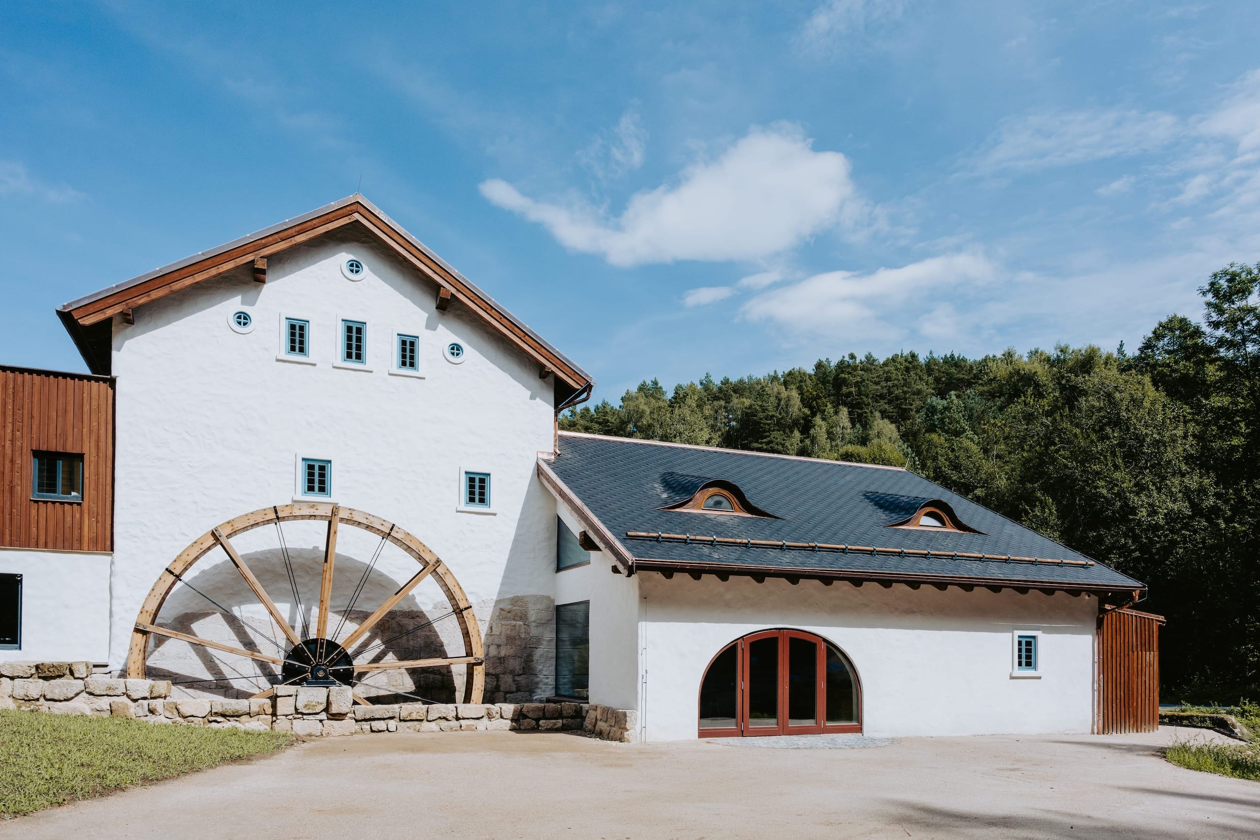 Charakter budovy a její dřívější funkci však určuje především ohromné mlýnské kolo. Už sto let se tady ovšem mouka nemele. Místo prašného provozu najdete za pomněnkovými vraty wellness hotel, který nostalgickou atmosféru starých dobrých časů kombinuje s ultimátním komfortem a zážitky na míru.