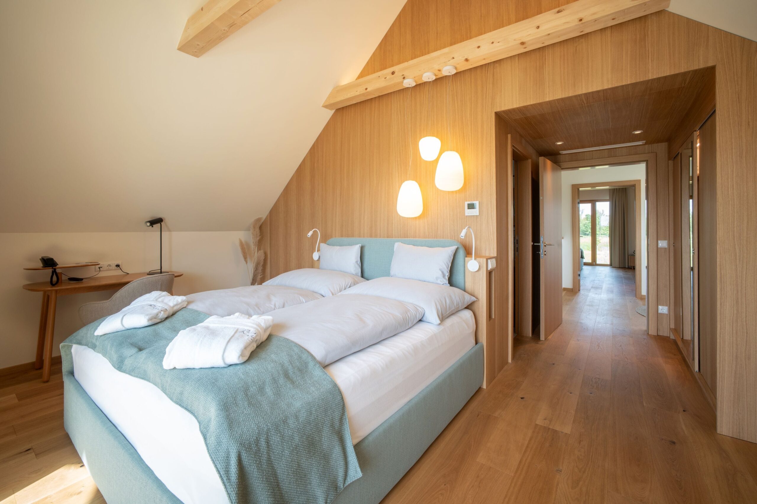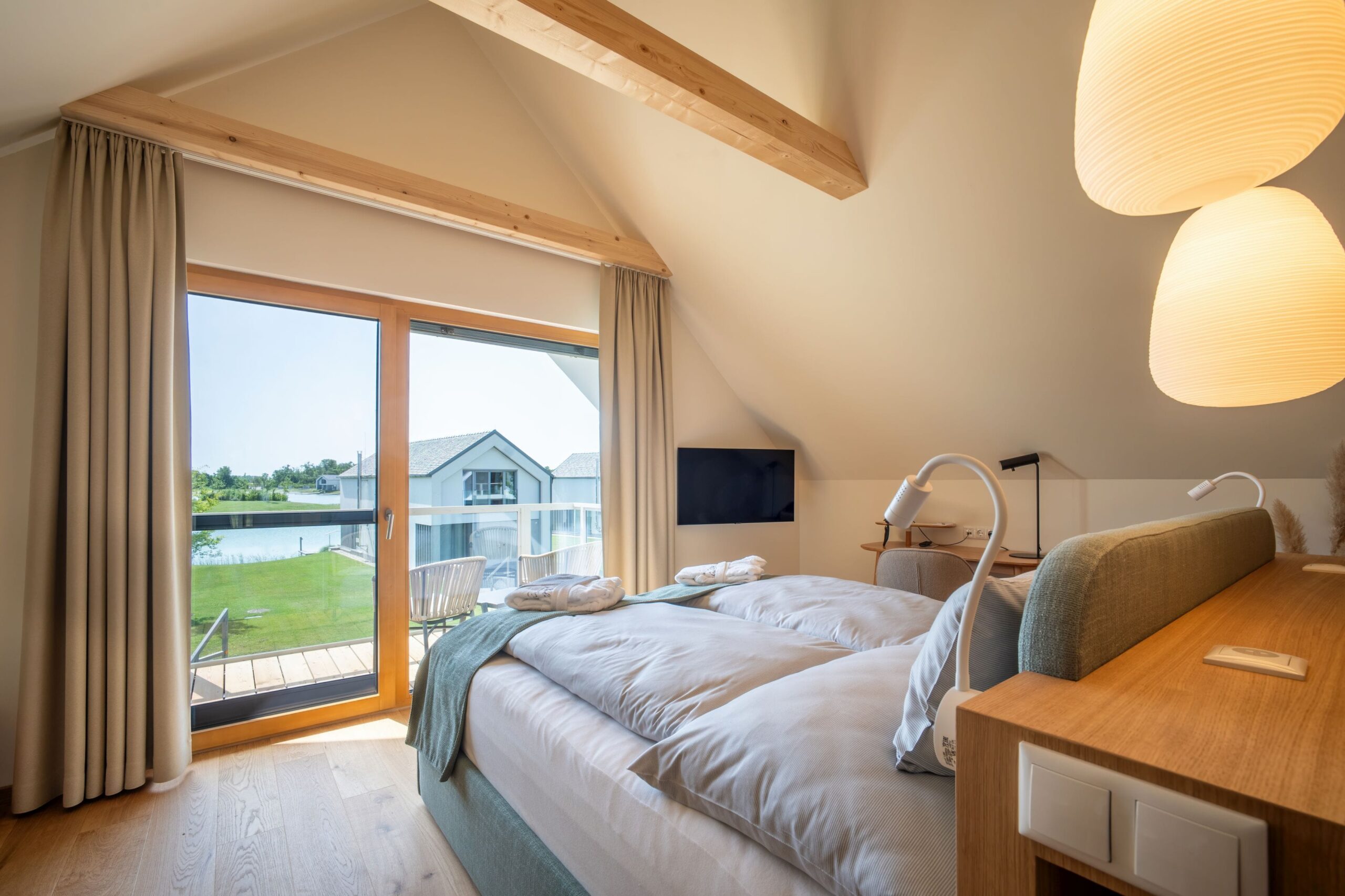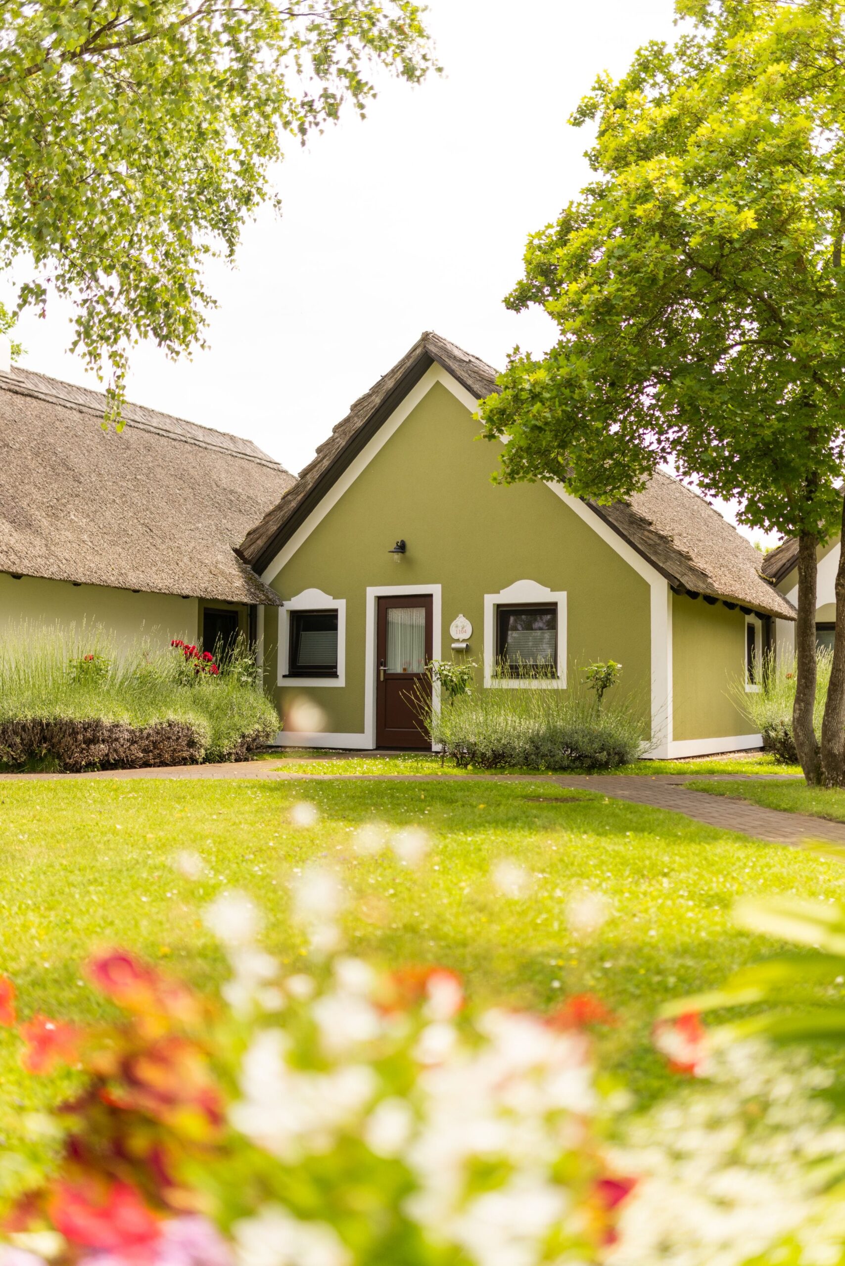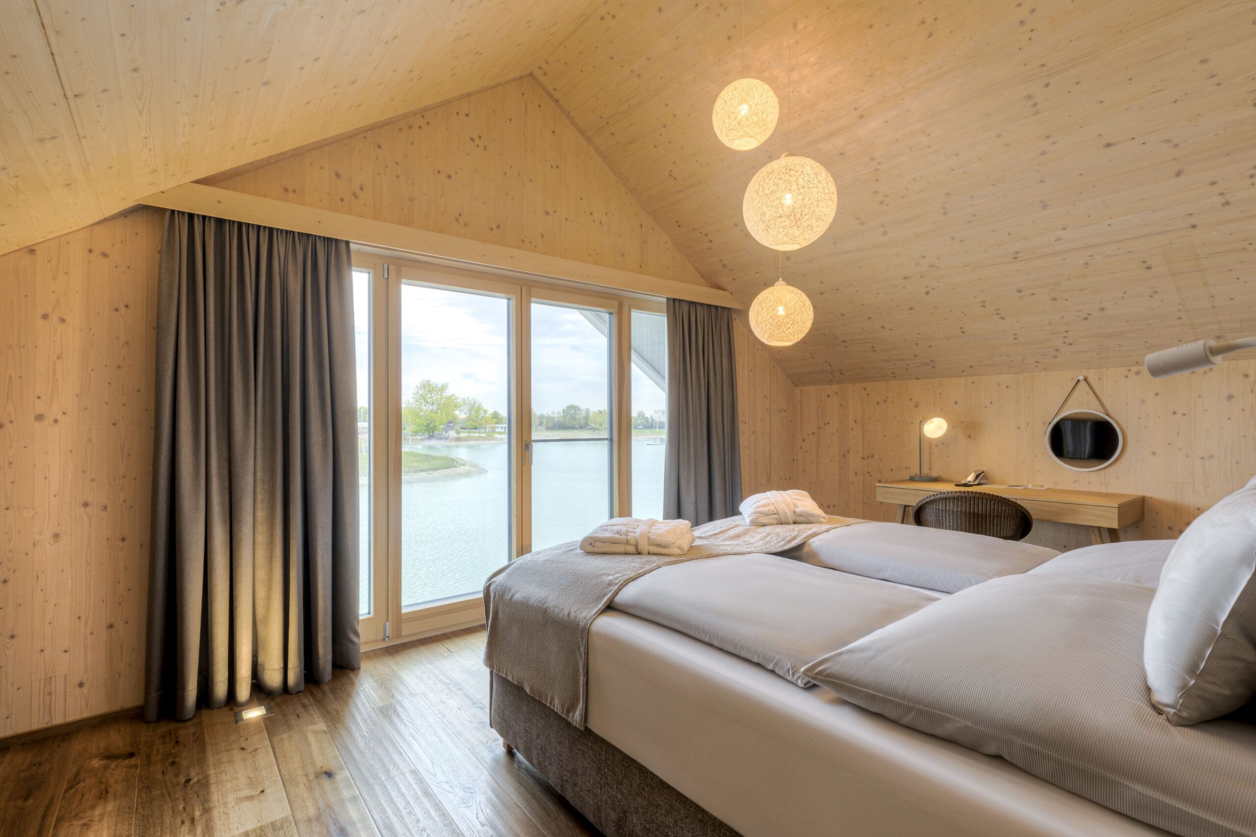 Areál je skutečně do svého okolí vkomponován dokonale. Poznáte to už z příjezdové cesty, která se citlivě vlní areálem a vede nás k původnímu hotelu ze sedmdesátých let. Kolem něj se první majitelé rozmáchli k areálu bungalovů v tradičním burgenlandském stylu s rákosovými střechami a současní majitelé pak připojili elegantní, zbrusu nové rezidence u jezera, kde jsme letos v první polovině září pobývali tři noci.