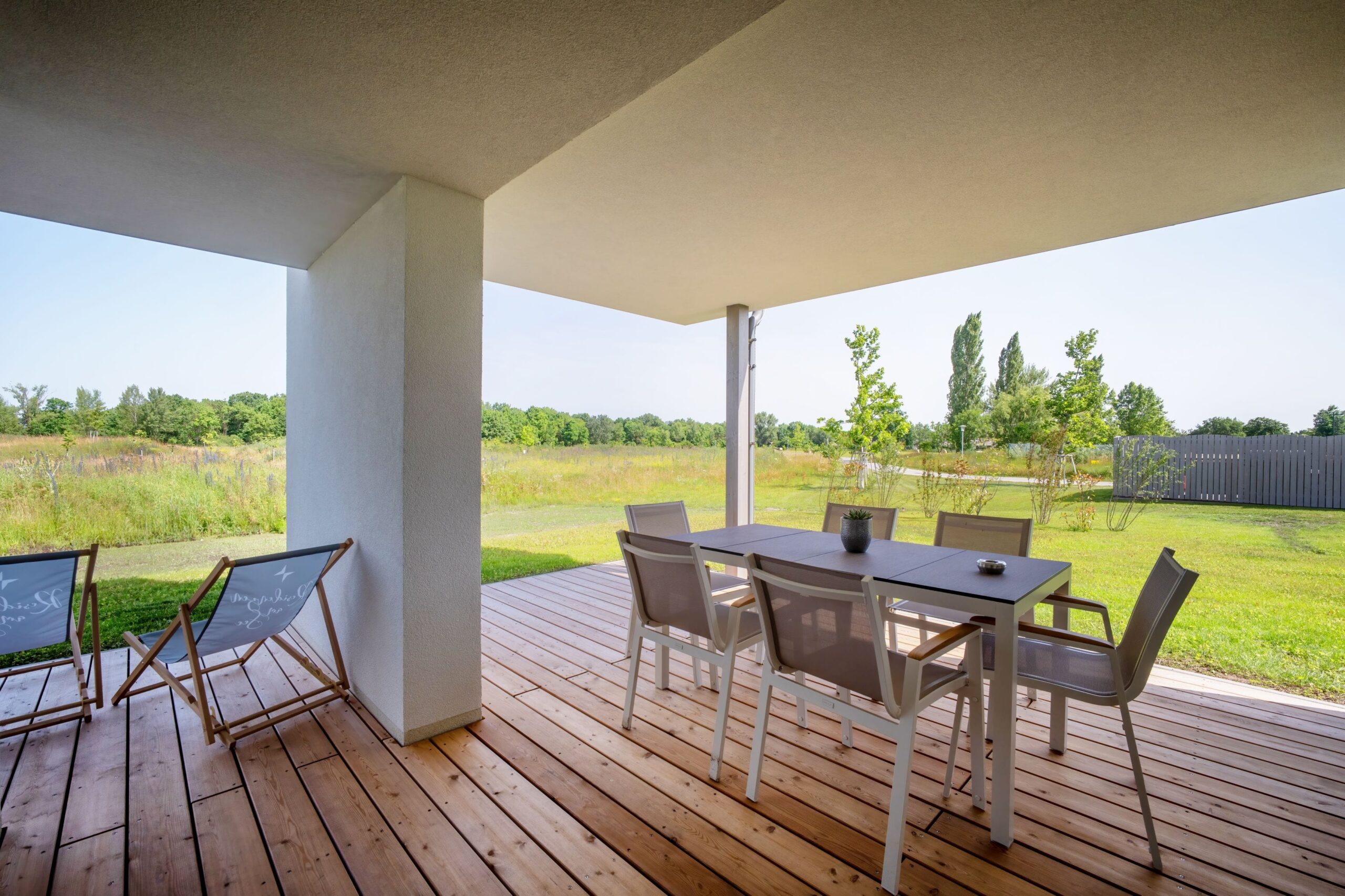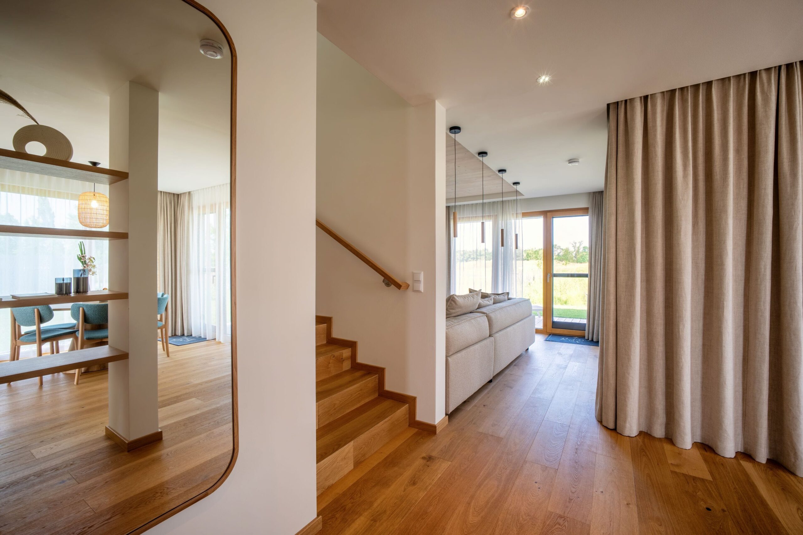 Rezidence Lakeside s jednotnou architekturou připomene americký venkov, kde každý dům s velkými okenicemi má dřevěné zápraží pro posezení, dokonalý trávník bez plotů a vlastní garáž. Před tou mají hosté navíc k dispozici pohodlná kola, kterými si lze urychlit pohyb mezi ubytováním, gastrem a atrakcemi, anebo lze vyjet za brány po nejbližším okolí. Všude jsou oddělené cyklostezky podél silnic, jsme přece v Rakousku, nezapomeňte.
