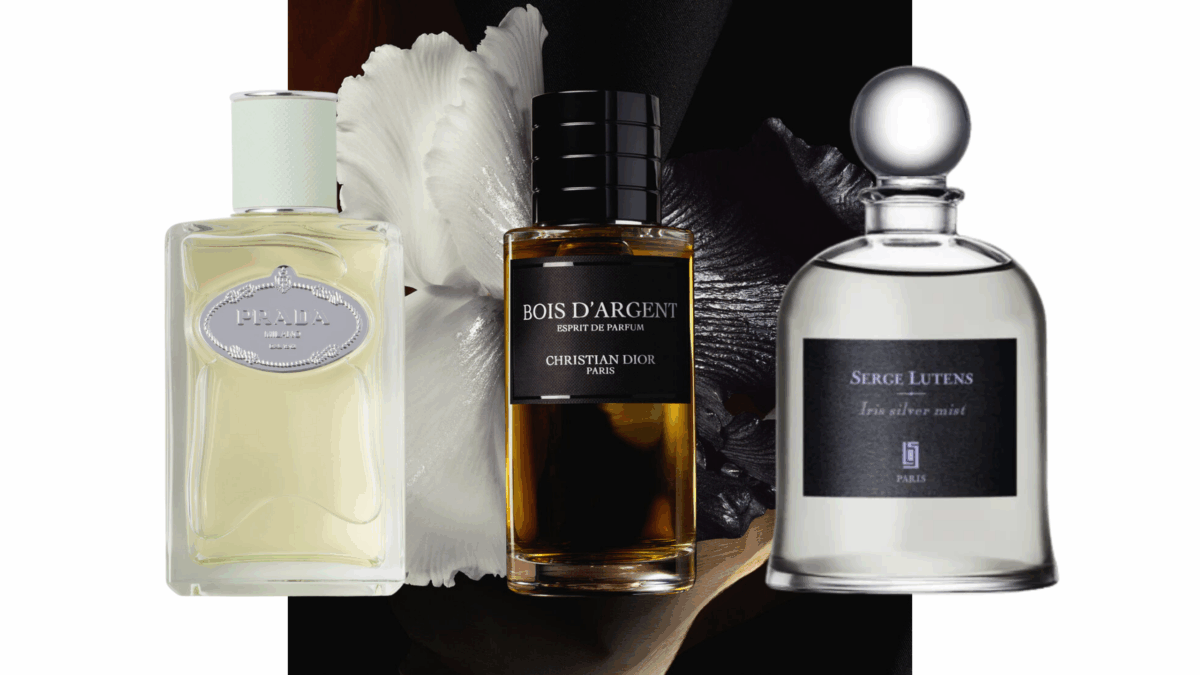 parfémovaná voda Prada Infusion d’Iris, 100 ml, 4600 Kč, koupíte zde; parfémový extrakt Dior Bois d’Argent, 80 ml, 10 500 Kč, koupíte zde; parfémovaná voda Serge Lutense Iris Silver Mist, 75 ml, 6300 Kč, koupíte zde
