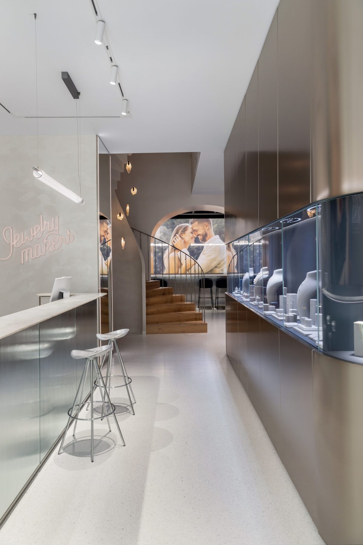 Hlavním konceptem showroomu v Dušní 6 bylo vytvořit prostor, který odráží charakter moderního internetového šperkařství – přehledný, funkční, a přitom elegantní a nadčasový. Nechtěli jsme klasický obchodní prostor zaplněný vitrínami, ale prostředí, které zákazníkovi nabídne klid, pohodlí a možnost se plně soustředit na samotné šperky.