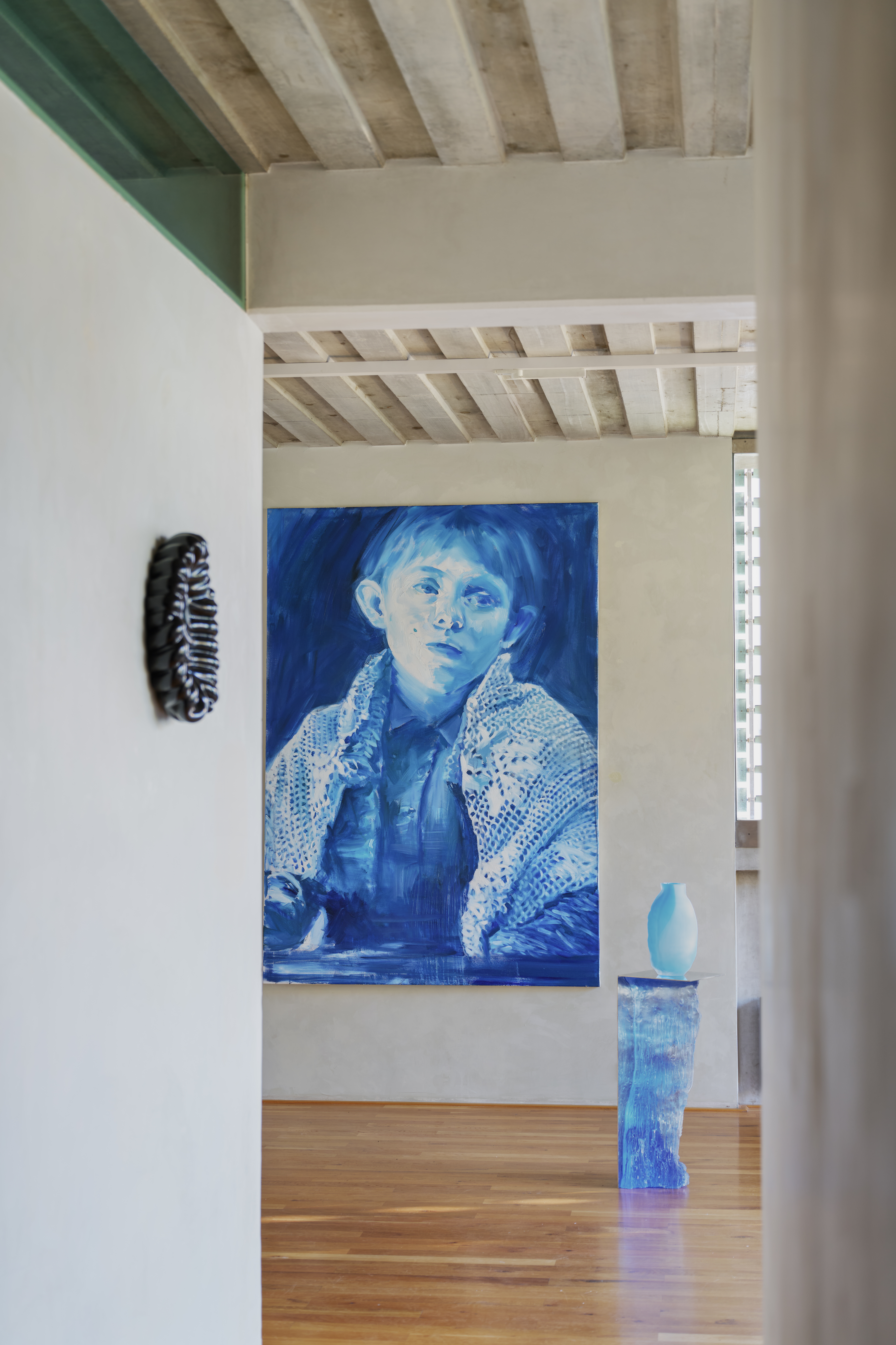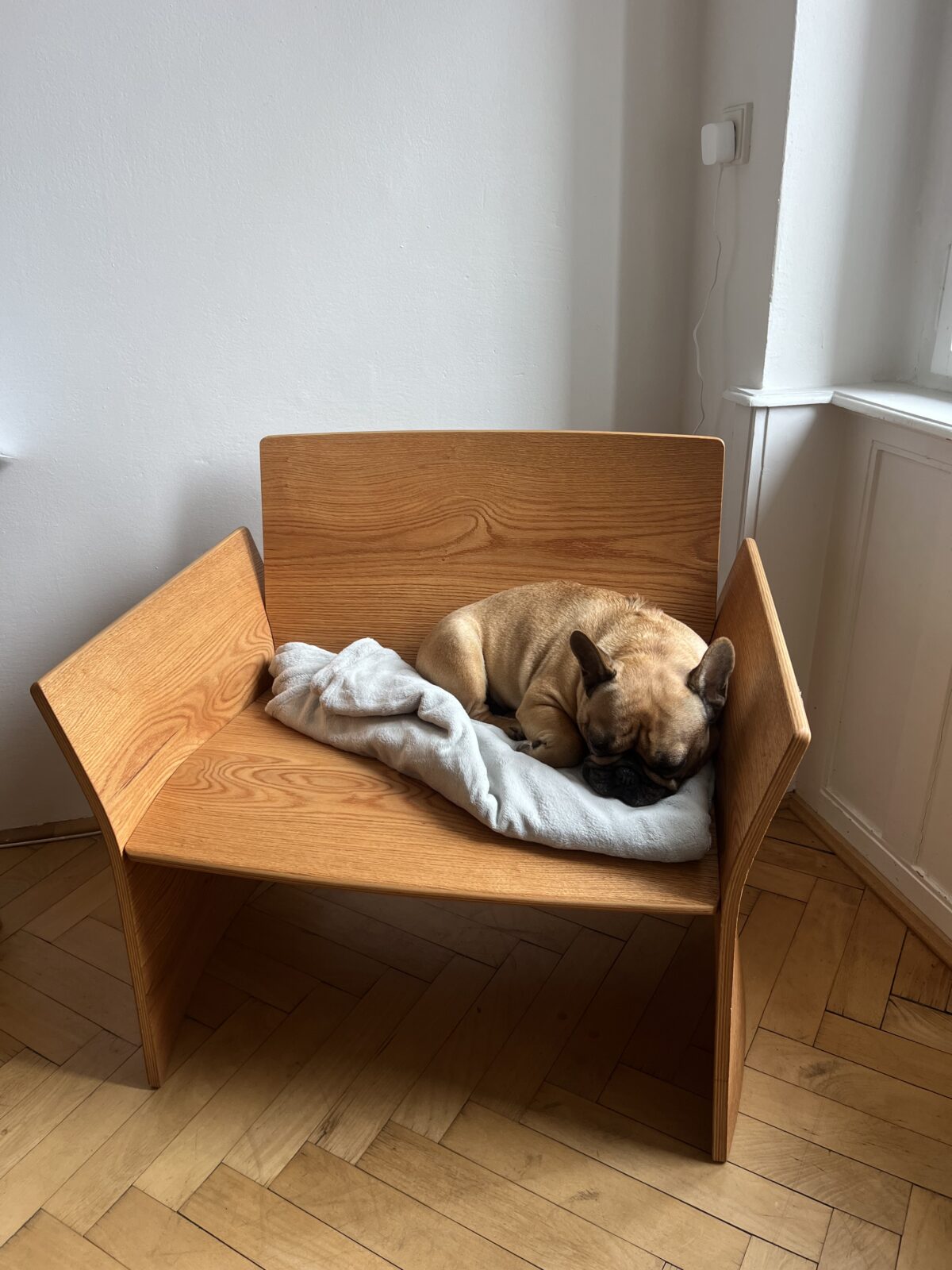 Nedávno jsem měl radost z nové barevné varianty své vázy Halv. Udělal jsem ji v modré barvě speciálně na výstavu v Nookar Studio. Ta kombinace modrá v modré mě skutečně baví. Je jednoduchá, ale hodně výrazná. Další velkou radost mi udělaly i moje nedávné narozeniny. Dostal jsem křeslo odkamaráda a designéra Filipa Krampla. Musím říct, že nejvíc ho ocenila naše fenka Meda. Koukněte, jak spokojeně na něm odpočívá.