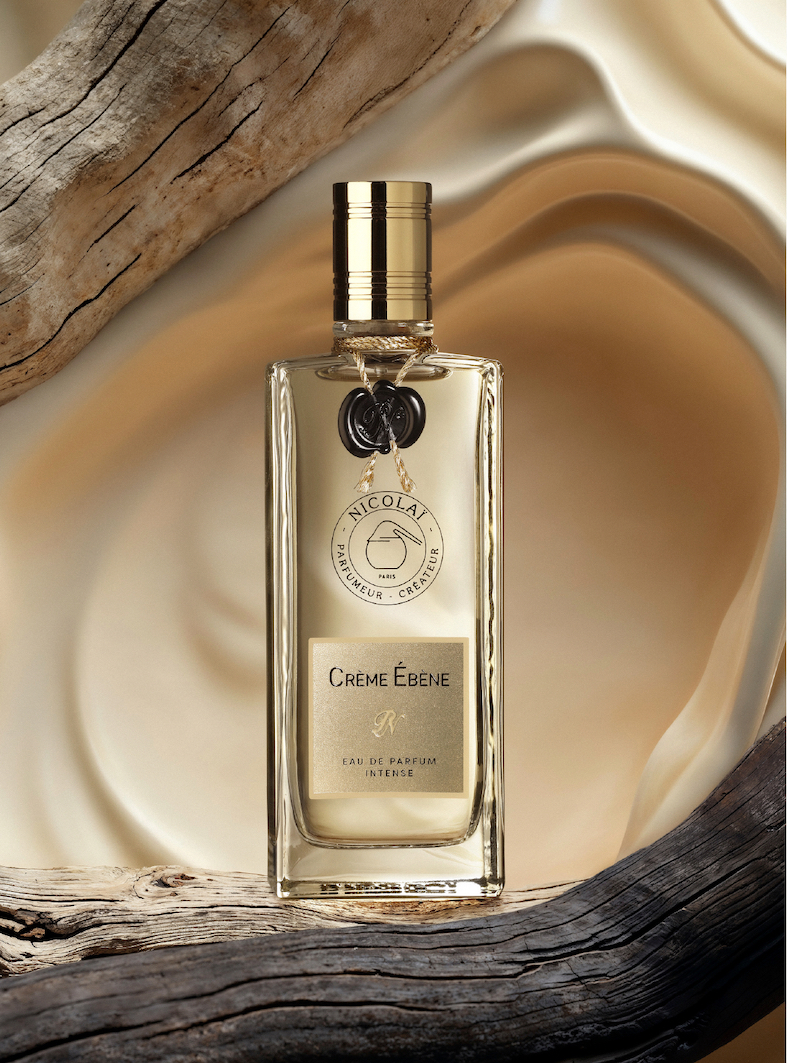 V nejnovější vůni z dílny Nicolaï se setkává majestátní síla ebenového dřeva s jemností, která má až návykový charakter. Crème Ébène je vůně postavená na kontrastech: syrová, dřevitá hloubka se zde propojuje s krémovou měkkostí, temnota s něžností a strohá elegance se zrcadlí v teple a smyslnosti. Výsledkem je parfém, který působí současně autoritativně i konejšivě. Už v úvodních tónech se rozvíjí bílý květinový akord, protkaný směsí koření, v níž hraje prim aromatický cejlonský kardamom, podpořený kmínem a žhavým dotekem šafránu. Tato dynamická kombinace otevírá cestu k srdci vůně, kde se zhmotňuje kontrast dřeva a sladkosti: majestátní atlaský a virginský cedr doplňuje lahodná datle Medjoul, která celé kompozici propůjčuje hřejivý gourmandový akcent. Základ pak odhaluje svou plnost a sofistikovanost. Temně zemitý papyrus a sametové santalové dřevo se snoubí s hloubkou indonéského pačuli, zatímco vanilka a bílé pižmo dodávají kompozici smyslnou hebkost a krémovou kulatost.
